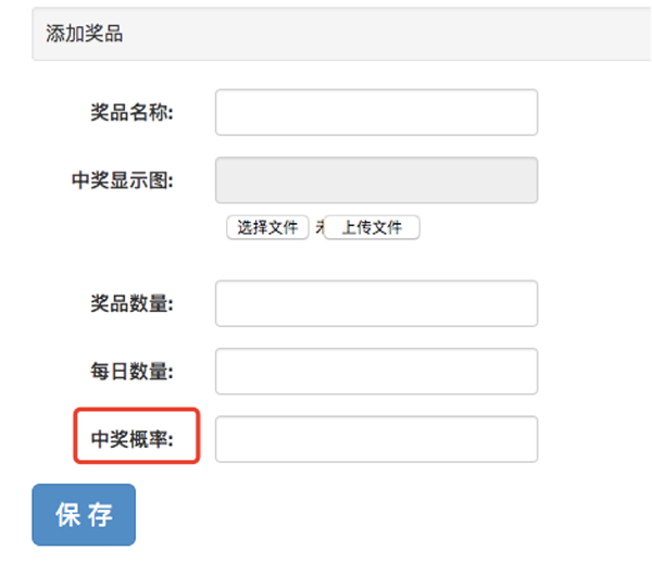 密室尋寶找到四個記憶碎片后,可進行抽獎,游戲管理后臺可對獎品進行設(shè)置,特別是填寫概率說明有幾個要點:1、概率必須是整數(shù) 2、總和為100,那么填寫1,表示1%的意思 3、總和為1000,那么填寫1000,表示千分之1,其實就是0.1%的意思