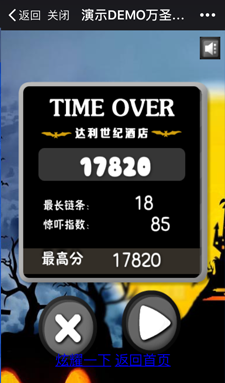 ? ? ? 填寫姓名和手機(jī)號(hào),馬上參加——不注冊(cè),先體驗(yàn)下——滑動(dòng)鏈接3個(gè)或更多相同款式萬(wàn)圣節(jié)小鬼,然后松開——限制時(shí)間內(nèi),連起的圖標(biāo)越多,得分越高——查看排行榜和規(guī)則