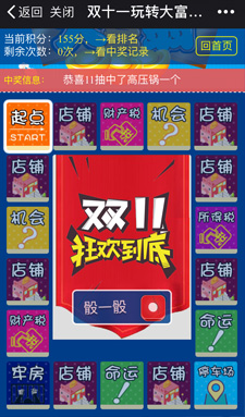 模擬大富翁玩法H5,投擲骰子,有一定中獎(jiǎng)概率,店鋪、財(cái)產(chǎn)稅、命運(yùn)、機(jī)會(huì)等充分體現(xiàn)雙11大富翁的主題。