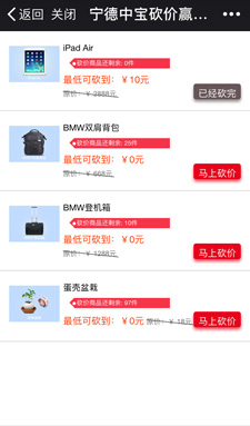 ? ? ?1、后臺可以配置不同的商品信息,名稱,砍價金額,庫存數(shù)量,最低低價,每日可以砍的數(shù)量?