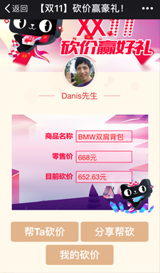 ? ? ?2、每個用戶可以自砍一刀,然后分享給小伙伴幫砍,每個好友只能幫砍一次;