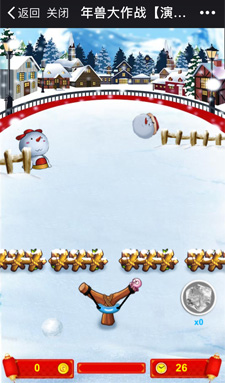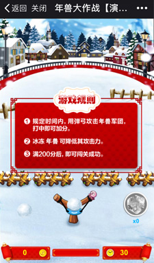游戲創(chuàng)意點:彈弓攻擊年獸軍團(tuán),打中可加分,冰凍降低其攻擊力。闖關(guān)成功,有抽獎機(jī)會,兌換獎品,可線上線下結(jié)合。