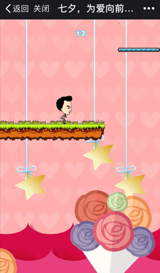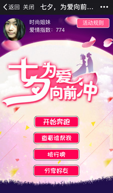 場景助力,中國傳統(tǒng)的情人節(jié),為愛向前沖,好玩樂趣的游戲,邀請好友助力玩,吸粉并強(qiáng)制關(guān)注。結(jié)合節(jié)日主題元素,游戲的推廣相當(dāng)好,大大超過商家預(yù)期。