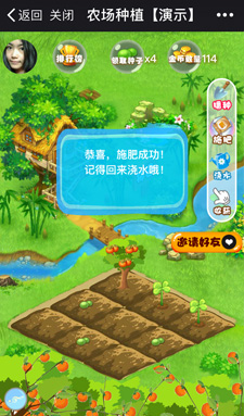 ? ? ? ?玩過開心農(nóng)場的伙伴們都有一個恒心,只有耐心播種才能收獲最美果實。游戲簡單化了,播種后,等待開花,可獲得金幣,金幣多了可兌換禮品卡。每天都可玩,是一款有粘性和樂趣的游戲?;顒訒r間1天,參與用戶數(shù)2萬多人,中獎用戶數(shù)3千多人。