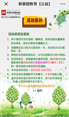 春天我們?nèi)シN樹、播綠、種下希望的種子。游戲中領(lǐng)取一棵樹苗,邀請(qǐng)好友助力澆水,收獲豪禮。游戲推廣效果顯著,以小成本,增長(zhǎng)了大數(shù)量的粉絲。