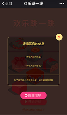 跳一跳小游戲的熱度高漲,根據(jù)跳一跳改版的歡樂跳一跳,是一個(gè)營銷性活動(dòng)。這是一款可以植入廣告的跳一跳活動(dòng),達(dá)到分?jǐn)?shù)可領(lǐng)取紅包?;顒?dòng)推出后,實(shí)現(xiàn)幾千幾萬粉絲參與,營銷效果非常顯著。