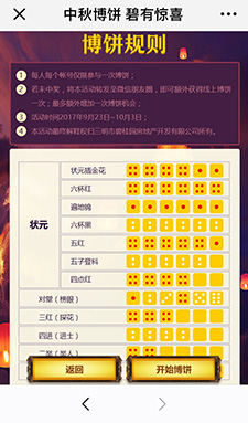 微信營(yíng)銷游戲——中秋博餅基礎(chǔ)版 是經(jīng)典款微信公眾號(hào)推廣游戲,可以直接租用模版,如果有其它訂制需求,歡迎提交需求給我們,進(jìn)行進(jìn)一步溝通和開(kāi)發(fā)。