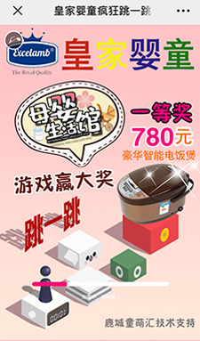 微信營(yíng)銷游戲——?dú)g樂(lè)跳一跳抽大獎(jiǎng)游戲是經(jīng)典款微信公眾號(hào)推廣游戲,可以直接租用模版,如果有其它訂制需求,歡迎提交需求給我們,進(jìn)行進(jìn)一步溝通和開(kāi)發(fā)。