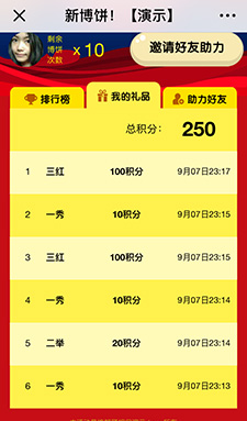 ? ? ? 進(jìn)入游戲——開(kāi)始博餅——活動(dòng)規(guī)則——每天x次擲骰子機(jī)會(huì)——邀請(qǐng)好友助力——查看積分榜,積分兌換——我的獎(jiǎng)勵(lì)