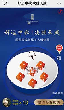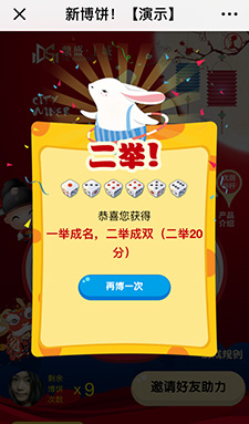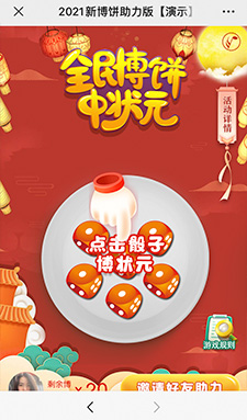 ????微信營(yíng)銷游戲——中秋博餅助力版 是經(jīng)典款微信公眾號(hào)推廣游戲,可以直接租用模版,如果有其它訂制需求,歡迎提交需求給我們,進(jìn)行進(jìn)一步溝通和開(kāi)發(fā)。
