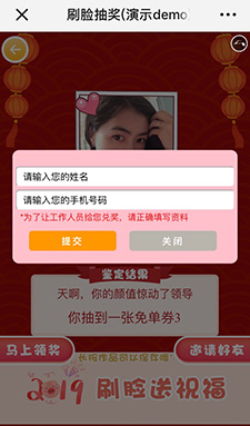 3、最終選擇開(kāi)始刷臉,合成一張刷臉照片進(jìn)行抽獎(jiǎng);可以抽紅包和實(shí)物,抽中紅包直接發(fā)紅包,抽中實(shí)物需要填寫(xiě)姓名和電話進(jìn)行領(lǐng)取獎(jiǎng)品;
