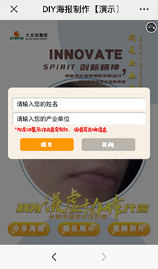 進入游戲——我要生成——上傳照片——輸入留言——生成海報——提交報名——保存圖片——重新制作