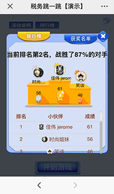 微信營(yíng)銷(xiāo)游戲——?dú)g樂(lè)跳一跳抽紅包游戲是經(jīng)典款微信公眾號(hào)推廣游戲,可以直接租用模版,如果有其它訂制需求,歡迎提交需求給我們,進(jìn)行進(jìn)一步溝通和開(kāi)發(fā)。