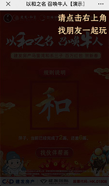 1、進(jìn)入游戲,點(diǎn)擊我要參與,然后進(jìn)入游戲,有一個(gè)“和”在頁面中間,灰色的。底部有一個(gè)【畫一筆】按鈕,點(diǎn)擊【畫一筆】,播放第一筆的動(dòng)畫,然后頁面變成已經(jīng)畫一筆的效果,之后分享給好友,每個(gè)好友點(diǎn)進(jìn)來后,可以幫忙助力畫一筆。