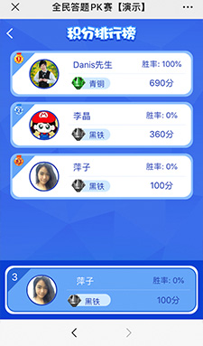 4、用戶每輪pk的積分都會(huì)累加,累加的成績(jī)計(jì)入排行榜,不同分?jǐn)?shù)對(duì)應(yīng)不同的等級(jí)