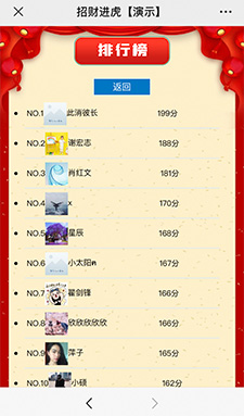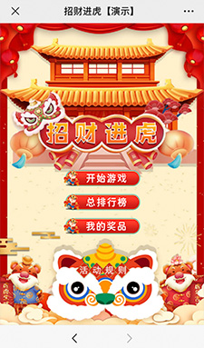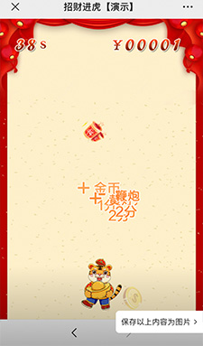 財(cái)神爺搶到金幣加分,接到炸彈減分,游戲樂趣十足。結(jié)合節(jié)日優(yōu)惠券促銷等,宣傳效果佳。分享好友或朋友圈增加活動(dòng)次數(shù),大大超過商家預(yù)期,在同類游戲中獨(dú)占鰲頭?;顒?dòng)時(shí)間7天,參與用戶數(shù)2萬多人,中獎(jiǎng)用戶數(shù)百人。