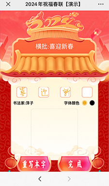 ? ? ? 進(jìn)入游戲——選擇一副春聯(lián)——寫上上聯(lián)下聯(lián)橫聯(lián)——生成春聯(lián)祝?!L(zhǎng)按頁(yè)面,保存祝福圖片或者分享好友