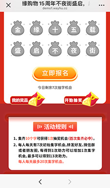 1、集齊x字可獲得1次抽獎機(jī)會,首次集齊必中;