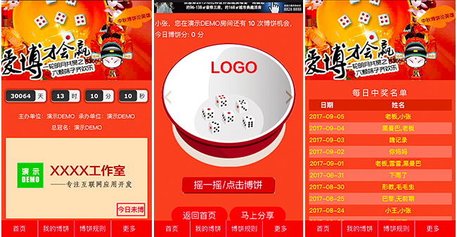 ? ? ? 中秋博餅五重奏:基礎版、美化版、吸粉版、助力版、多桌位版,這些微信游戲小系統(tǒng),結合了大多數(shù)客戶的需求,比如用戶登陸、用戶注冊、積分查詢、關注公眾號等。系統(tǒng)后臺開發(fā)上記錄了用戶信息,累積用戶每次博餅的積分情況,理清邏輯結構,然后采用php語言進行編寫,加上前臺界面美化,很完美的微信博餅游戲就在市面上推廣開來。