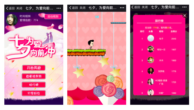 ? ? ? ?微信酷跑游戲是較為經(jīng)典的游戲玩法之一,界面好看的美術(shù)場(chǎng)景,用戶可長(zhǎng)按或者滑動(dòng)進(jìn)行控制力訓(xùn)練,再配合音樂(lè)效果更佳。多數(shù)微信酷跑游戲是通過(guò)點(diǎn)擊小人跳躍或者左右拖動(dòng)小人躲避障礙物,爭(zhēng)取使小人跑得更遠(yuǎn),在跑的過(guò)程中拾取金幣等可以加分。在很多大型酷跑(如天天酷跑、逃離神廟等)的帶動(dòng)下,微信酷跑小游戲也可以聚集不錯(cuò)的人氣,成為微信營(yíng)銷推廣不可或缺的插件和微信節(jié)日必玩的推廣活動(dòng)。