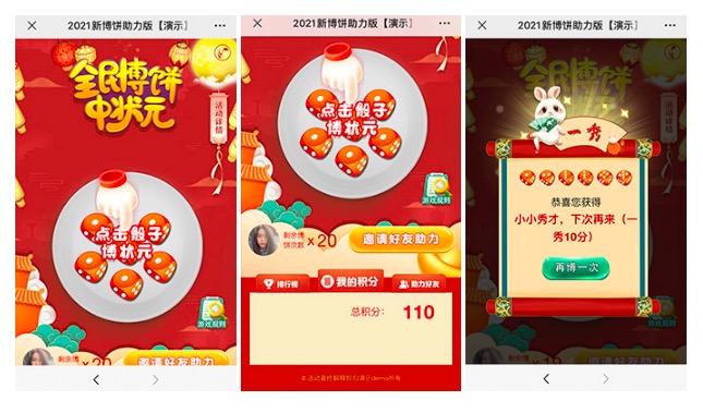 微信博餅游戲的設(shè)計(jì)開發(fā)目的是為了預(yù)熱中秋廈門閩南地區(qū)博餅文化節(jié),實(shí)現(xiàn)線上線下博餅活動(dòng)相結(jié)合,使得博餅搖骰子游戲能帶火朋友圈,成為疫情情況下商家營銷的利器之一。