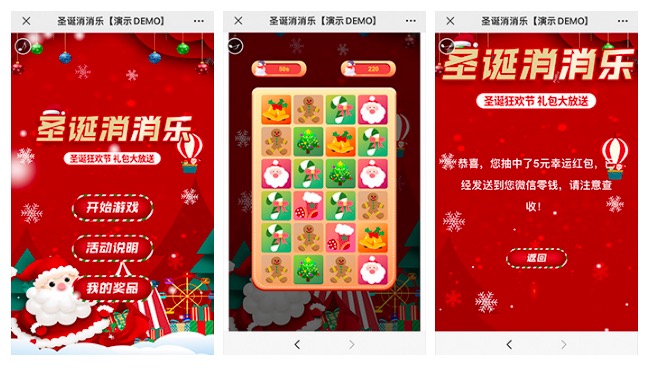 圣誕消消樂(lè)闖關(guān),闖關(guān)成功達(dá)到x分可參與大轉(zhuǎn)盤(pán)抽獎(jiǎng)